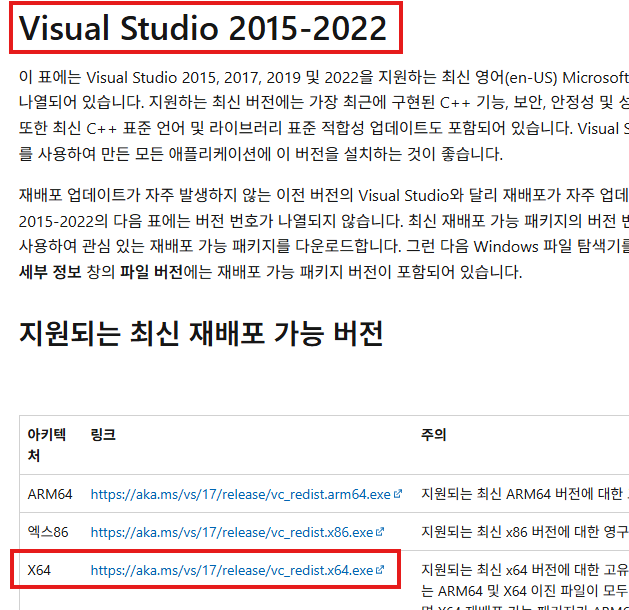 지원되는 최신 Visual C++ 재배포 가능 패키지 다운로드