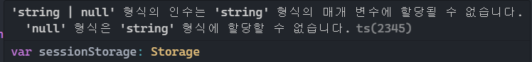 타스로 쓰다보면 자꾸 빨간줄이 생기는데 일단 첫번째 1. getItem에 에러날 경우 const item = JSON.parse(sessionStorage.getItem(k)!); 뒤에 느낌표를 쓰기. 2. key에 에러날 경우 // 반복문이라서 i가 있음 const k = sessionStorage.key(i); if (k && k.includes('user')) {}; 첫번째는 따로 변수로 받아서 if문에서 갸가 있을 경우~를 써주고 처리하면 된다. if (sessionStorage.key(i)?.includes('user')) {} 변수로 처리하기 싫다면 이렇게 물음표를 key뒤에 붙이면 됨!